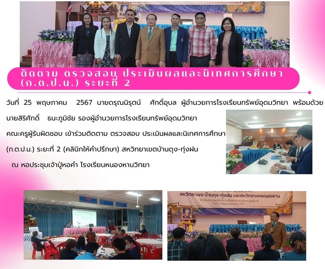 วันที่ 25 พฤษภาคม 2567 นายดรุณนิรุตน์ ศักดิ์อุบล ผู้อำนวยการโรงเรียนทรัพย์อุดมวิทยา พร้อมด้วย นายสิริศักดิ์ ธนะภูมิชัย รองผู้อำนวยการโรงเรียนทรัพย์อุดมวิทยา คณะครูผู้รับผิดชอบ เข้าร่วมติดตาม ตรวจสอบ ประเมินผลและนิเทศการศึกษา (ก.ต.ป.น.) ระยะที่ 2 (คลินิกให้คำปรึกษา) สหวิทยาเขตบ้านดุง-ทุ่งฝน ณ หอประชุมเจ้าปู่หอคำ โรงเรียนหนองหานวิทยา