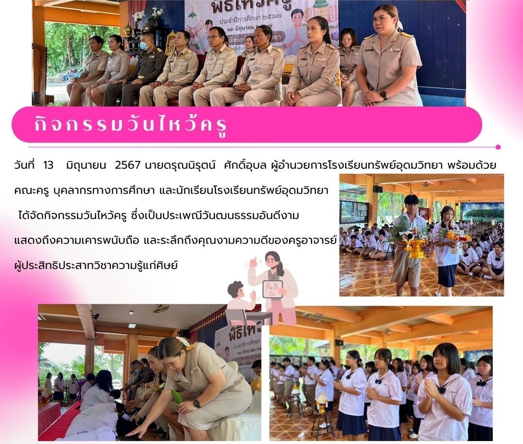 วันที่ 13 มิถุนายน 2567 นายดรุณนิรุตน์ ศักดิ์อุบล ผู้อำนวยการโรงเรียนทรัพย์อุดมวิทยา พร้อมด้วย คณะครู บุคลากรทางการศึกษา และนักเรียนโรงเรียนทรัพย์อุดมวิทยาได้จัดกิจกรรมวันไหว้ครู ซึ่งเป็นประเพณีวัฒนธรรมอันดีงาม แสดงถึงความเคารพนับถือ และระลึกถึงคุณงามความดีของครูอาจารย์ผู้ประสิทธิประสาทวิชาความรู้แก่ศิษย์