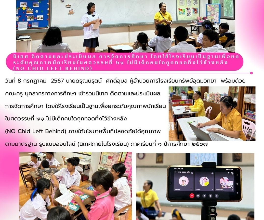 วันที่ 8 กรกฎาคม 2567 นายดรุณนิรุตน์ ศักดิ์อุบล ผู้อำนวยการโรงเรียนทรัพย์อุดมวิทยา พร้อมด้วย คณะครู บุคลากรทางการศึกษา เข้าร่วมนิเทศ ติดตามและประเมินผลการจัดการศึกษา โดยใช้โรงเรียนเป็นฐานเพื่อยกระดับคุณภาพนักเรียนในศตวรรษที่ ๒๑ ไม่มีเด็กคนใดถูกทอดทิ้งไว้ข้างหลัง (NO Chid Left Behind) ภายใต้นโยบายพื้นที่ปลอดภัยได้คุณภาพตามมาตรฐาน รูปแบบออนไลน์ (นิเทศภายในโรงเรียน) ภาคเรียนที่ ๑ ปีการศึกษา ๒๕๖๗