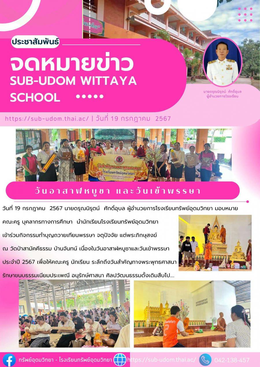 คณะครู บุคลากรทางการศึกษา นำนักเรียนโรงเรียนทรัพย์อุดมวิทยา เข้าร่วมกิจกรรมทำบุญถวายเทียนพรรษา จตุปัจจัย แต่พระภิกษุสงฆ์ ณ วัดป่าสามัคคีธรรม บ้านจันทน์ เนื่องในวันอาสาฬหบูชาและวันเข้าพรรษาประจำปี 2567 เพื่อให้คณะครู นักเรียน ระลึกถึงวันสำคัญทางพระพุทธศาสนา รักษาขนบธรรมเนียมประเพณี อนุรักษ์ศาสนา ศิลปวัฒนธรรมดั้งเดิมสืบไป....