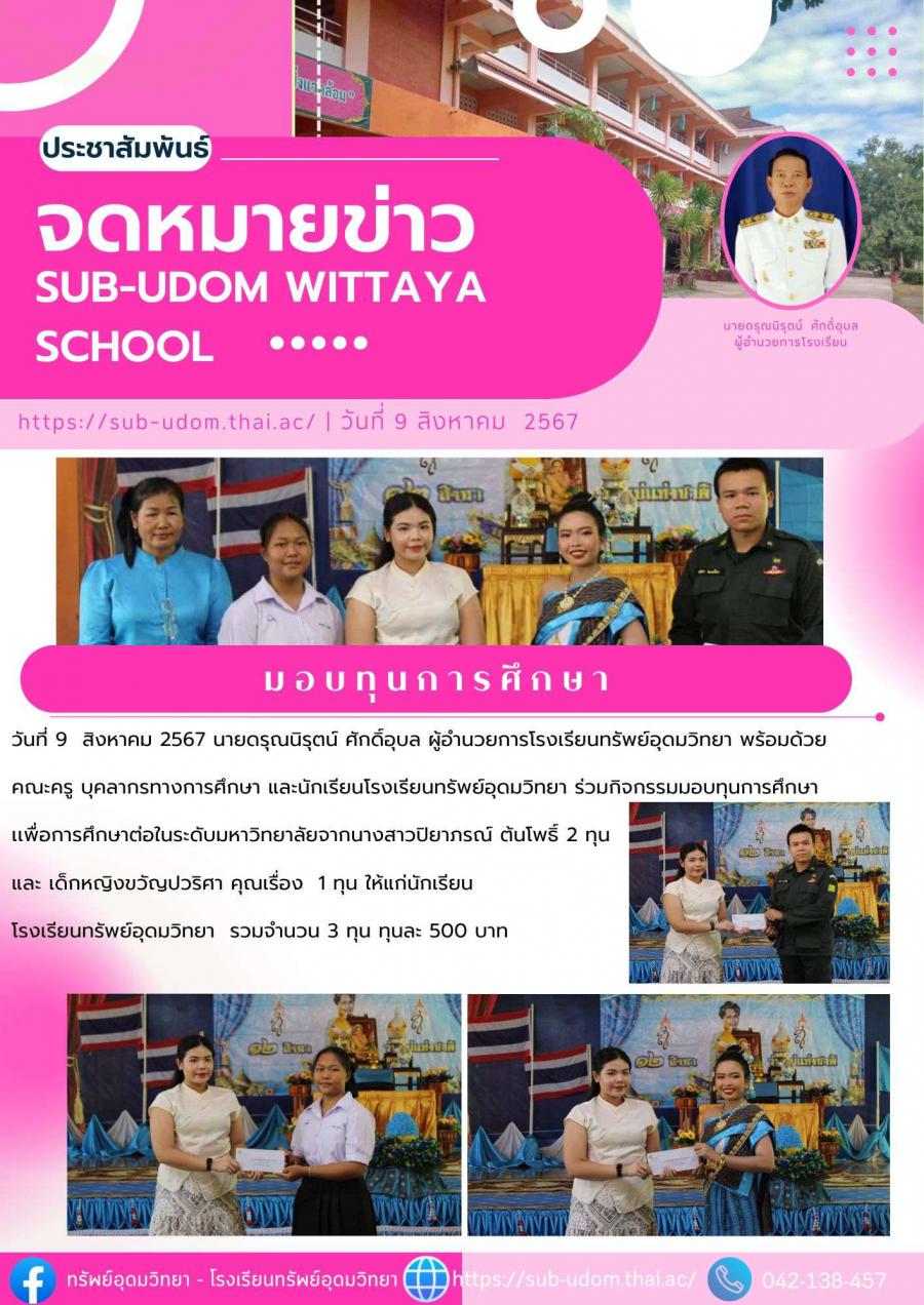 วันที่ 9 สิงหาคม 2567 นายดรุณนิรุตน์ ศักดิ์อุบล ผู้อำนวยการโรงเรียนทรัพย์อุดมวิทยา พร้อมด้วย คณะครู บุคลากรทางการศึกษา และนักเรียนโรงเรียนทรัพย์อุดมวิทยา ร่วมกิจกรรมมอบทุนการศึกษาเพื่อการศึกษาต่อในระดับมหาวิทยาลัยจากนางสาวปิยาภรณ์ ต้นโพธิ์ 2 ทุน และ เด็กหญิงขวัญปวริศา คุณเรื่อง 1 ทุน ให้แก่นักเรียนโรงเรียนทรัพย์อุดมวิทยา รวมจำนวน 3 ทุน ทุนละ 500 บาท