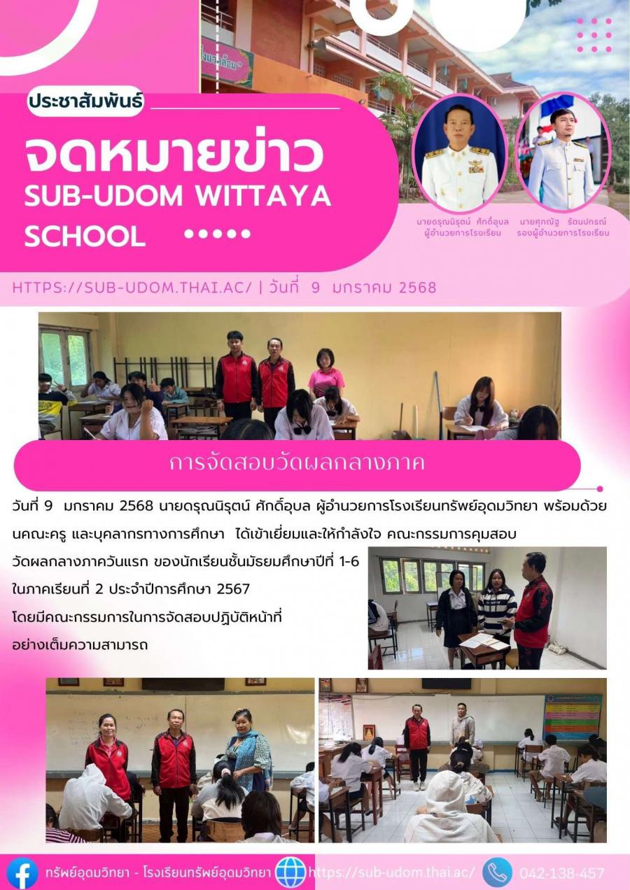 วันที่ 9 มกราคม 2568 นายดรุณนิรุตน์ ศักดิ์อุบล ผู้อำนวยการโรงเรียนทรัพย์อุดมวิทยา พร้อมด้วย นายศุภณัฐ รัตนปกรณ์ รองผู้อำนวยการโรงเรียน คณะครู และบุคลากรทางการศึกษา ได้เข้าเยี่ยมและให้กำลังใจ คณะกรรมการคุมสอบวัดผลกลางภาควันแรก ของนักเรียนชั้นมัธยมศึกษาปีที่ 1-6 ในภาคเรียนที่ 2 ประจำปีการศึกษา 2567