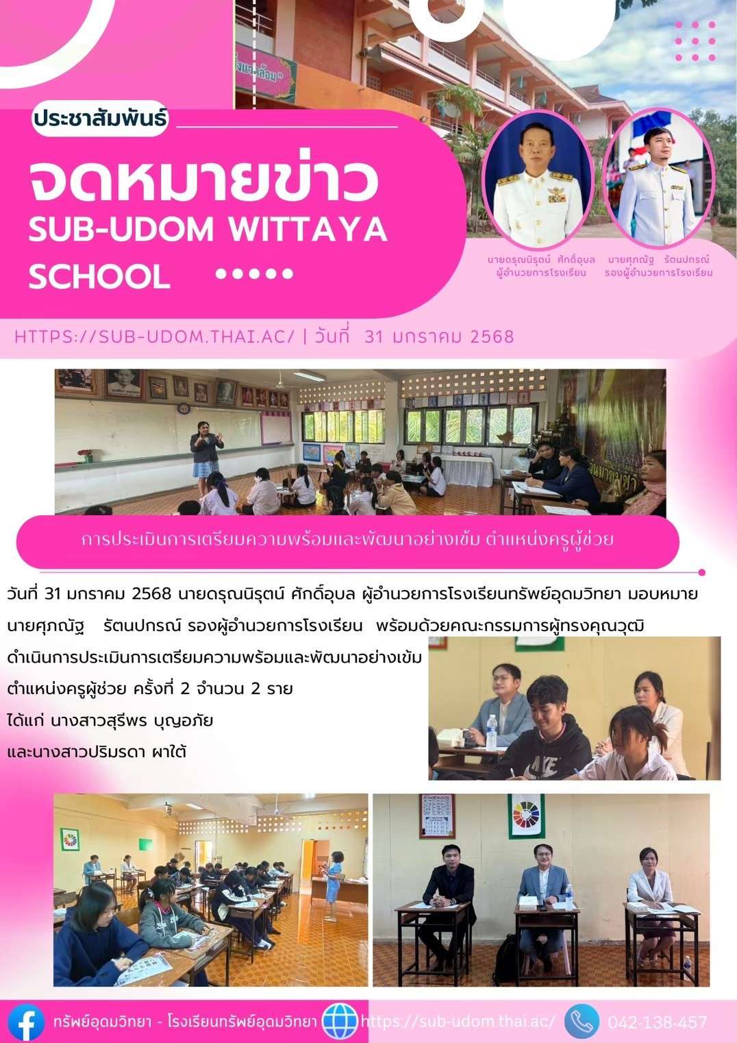 วันที่ 31 มกราคม 2568 นายดรุณนิรุตน์ ศักดิ์อุบล ผู้อำนวยการโรงเรียนทรัพย์อุดมวิทยา มอบหมาย นายศุภณัฐ รัตนปกรณ์ รองผู้อำนวยการโรงเรียน พร้อมด้วยคณะกรรมการผู้ทรงคุณวุฒิ ดำเนินการประเมินการเตรียมความพร้อมและพัฒนาอย่างเข้ม ตำแหน่งครูผู้ช่วย ครั้งที่ 2 จำนวน 2 ราย ได้แก่ นางสาวสุรีพร บุญอภัย และนางสาวปริมรดา ผาใต้
