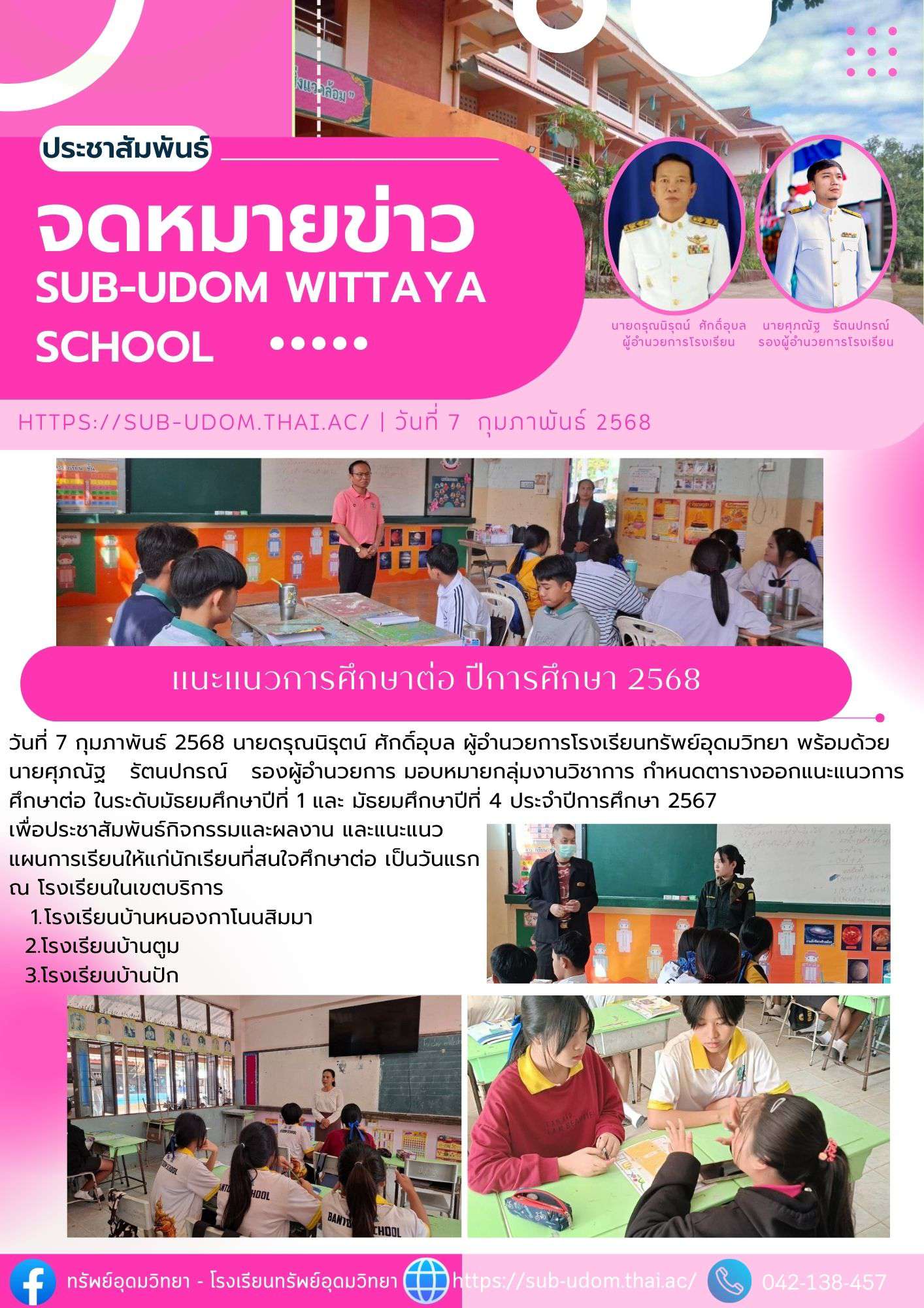 วันที่ 7 กุมภาพันธ์ 2568 นายดรุณนิรุตน์ ศักดิ์อุบล ผู้อำนวยการโรงเรียนทรัพย์อุดมวิทยา พร้อมด้วย นายศุภณัฐ รัตนปกรณ์ รองผู้อำนวยการ มอบหมายกลุ่มงานวิชาการ กำหนดตารางออกแนะแนวการศึกษาต่อ ในระดับมัธยมศึกษาปีที่ 1 และ มัธยมศึกษาปีที่ 4 ประจำปีการศึกษา 2567