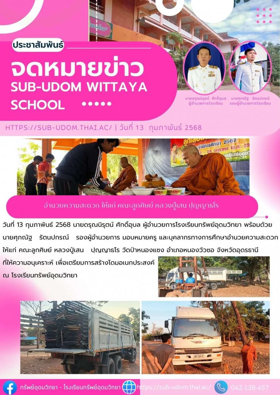 วันที่ 13 กุมภาพันธ์ 2568 นายดรุณนิรุตน์ ศักดิ์อุบล ผู้อำนวยการโรงเรียนทรัพย์อุดมวิทยา พร้อมด้วยนายศุภณัฐ รัตนปกรณ์ รองผู้อำนวยการ มอบหมายครู และบุคลากรทางการศึกษาอำนวยความสะดวก ให้แก่ คณะลูกศิษย์ หลวงปู่เสน ปฺญญาธโร วัดป่าหนองแซง อำเภอหนองวัวซอ จังหวัดอุดรธานีที่ให้ความอนุเคราะห์ เพื่อเตรียมการสร้างโดมอเนกประสงค์