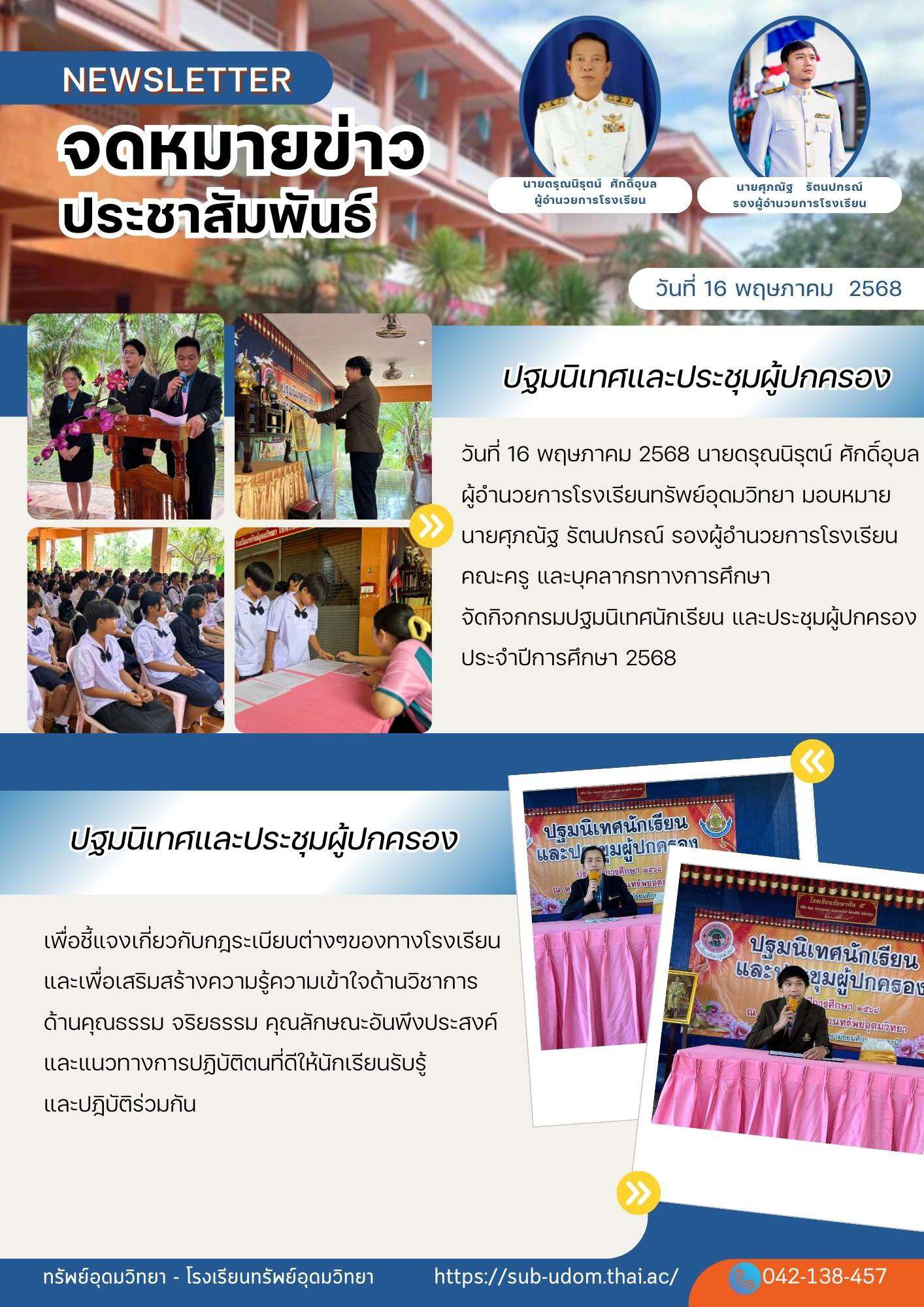 วันที่ 16 พฤษภาคม 2568 นายดรุณนิรุตน์ ศักดิ์อุบล ผู้อำนวยการโรงเรียนทรัพย์อุดมวิทยา มอบหมาย นายศุภณัฐ รัตนปกรณ์ รองผู้อำนวยการโรงเรียน คณะครู และบุคลากรทางการศึกษาจัดกิจกรรมปฐมนิเทศนักเรียน และประชุมผู้ปกครอง ประจำปีการศึกษา 2568 เพื่อชี้แจงเกี่ยวกับกฎระเบียบต่างๆของทางโรงเรียนและเพื่อเสริมสร้างความรู้ความเข้าใจด้านวิชาการ