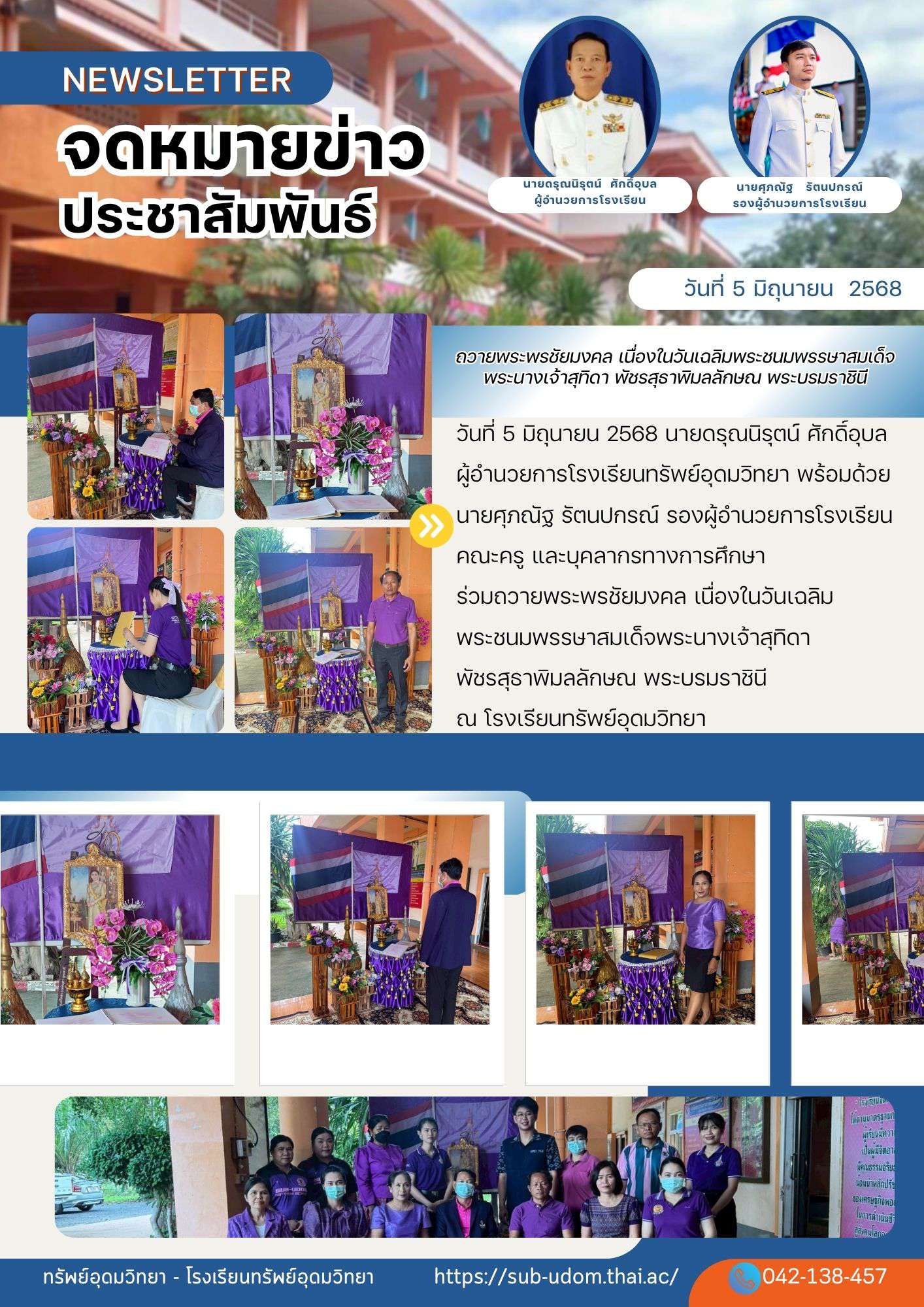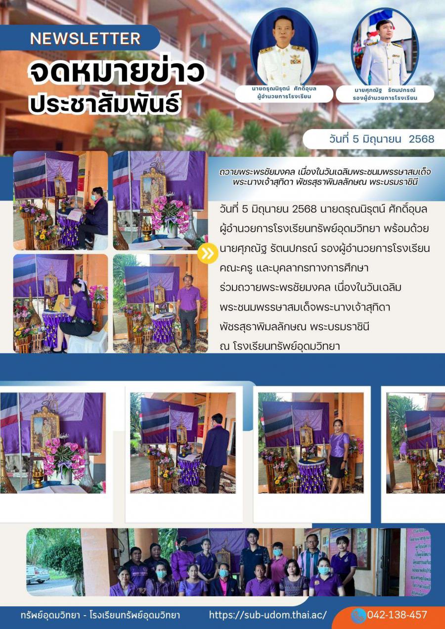 วันที่ 5 มิถุนายน 2568 นายดรุณนิรุตน์ ศักดิ์อุบล ผู้อำนวยการโรงเรียนทรัพย์อุดมวิทยา พร้อมด้วยนายศุภณัฐ รัตนปกรณ์ รองผู้อำนวยการโรงเรียน คณะครู และบุคลากรทางการศึกษา ร่วมถวายพระพรชัยมงคล เนื่องในวันเฉลิมพระชนมพรรษาสมเด็จพระนางเจ้าสุทิดา พัชรสุธาพิมลลักษณ พระบรมราชินี ณ โรงเรียนทรัพย์อุดมวิทยา