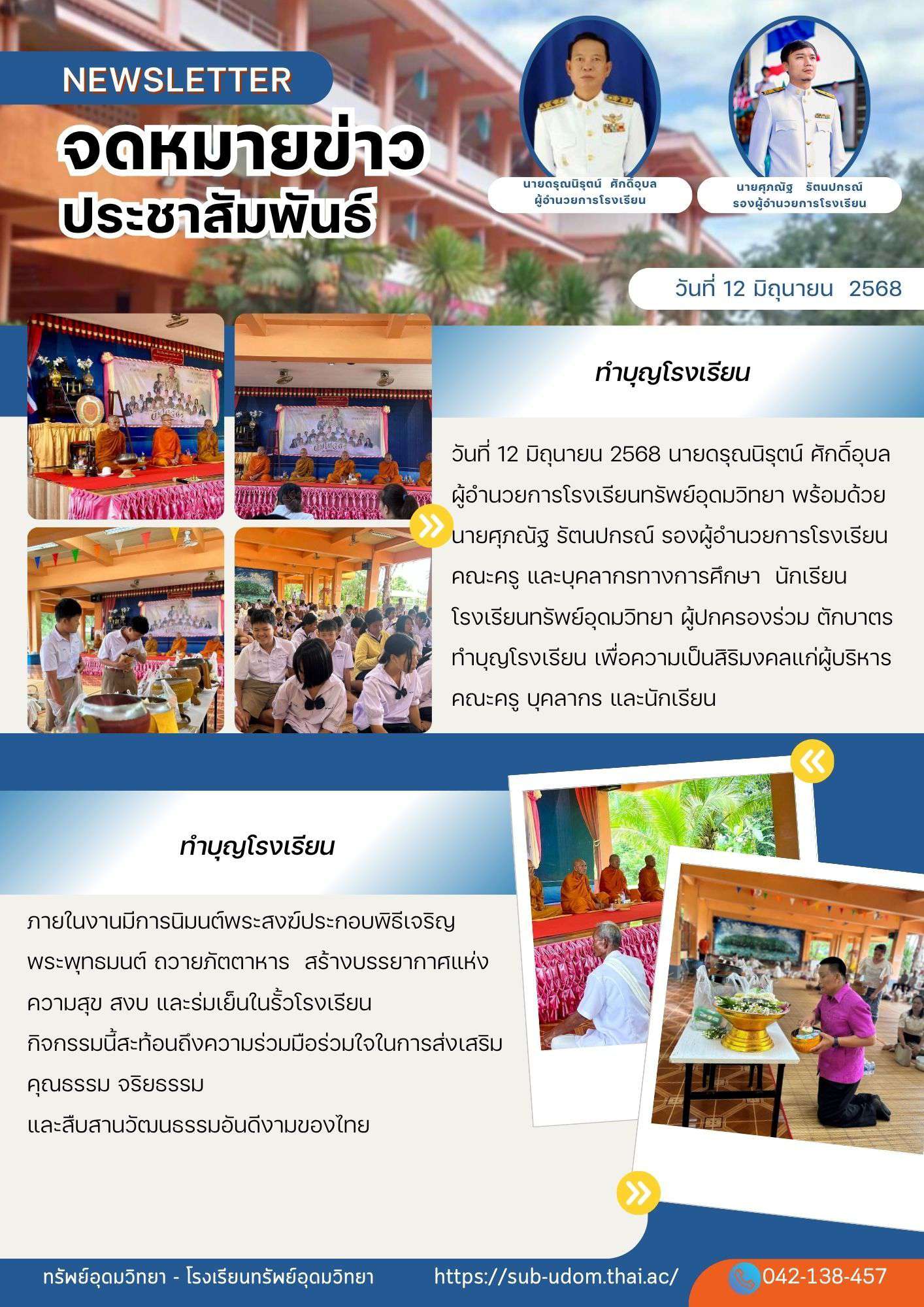 วันที่ 12 มิถุนายน 2568 นายดรุณนิรุตน์ ศักดิ์อุบล ผู้อำนวยการโรงเรียนทรัพย์อุดมวิทยา พร้อมด้วย นายศุภณัฐ รัตนปกรณ์ รองผู้อำนวยการโรงเรียน คณะครู และบุคลากรทางการศึกษา นักเรียนโรงเรียนทรัพย์อุดมวิทยา ผู้ปกครองร่วม ตักบาตร ทำบุญโรงเรียน เพื่อความเป็นสิริมงคลแก่ผู้บริหาร คณะครู บุคลากร และนักเรียน ภายในงานมีการนิมนต์พระสงฆ์ประกอบพิธีเจริญพระพุทธมนต์ ถวายภัตตาหาร สร้างบรรยากาศแห่งความสุข สงบ และร่มเย็นในรั้วโรงเรียน กิจกรรมนี้สะท้อนถึงความร่วมมือร่วมใจในการส่งเสริมคุณธรรม จริยธรรม และสืบสานวัฒนธรรมอันดีงามของไทย