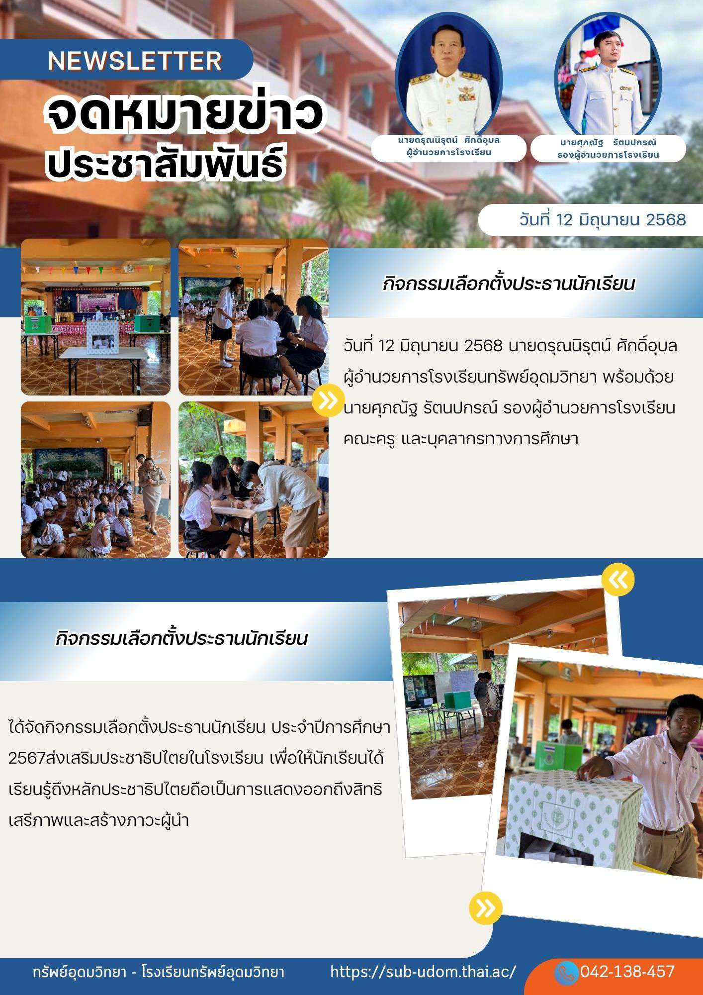 วันที่ 12 มิถุนายน 2568 นายดรุณนิรุตน์ ศักดิ์อุบล ผู้อำนวยการโรงเรียนทรัพย์อุดมวิทยา พร้อมด้วย นายศุภณัฐ รัตนปกรณ์ รองผู้อำนวยการโรงเรียน คณะครู และบุคลากรทางการศึกษาได้จัดกิจกรรมเลือกตั้งประธานนักเรียน ประจำปีการศึกษา 2568ส่งเสริมประชาธิปไตยในโรงเรียน เพื่อให้นักเรียนได้เรียนรู้ถึงหลักประชาธิปไตยถือเป็นการแสดงออกถึงสิทธิเสรีภาพและสร้างภาวะผู้นำ